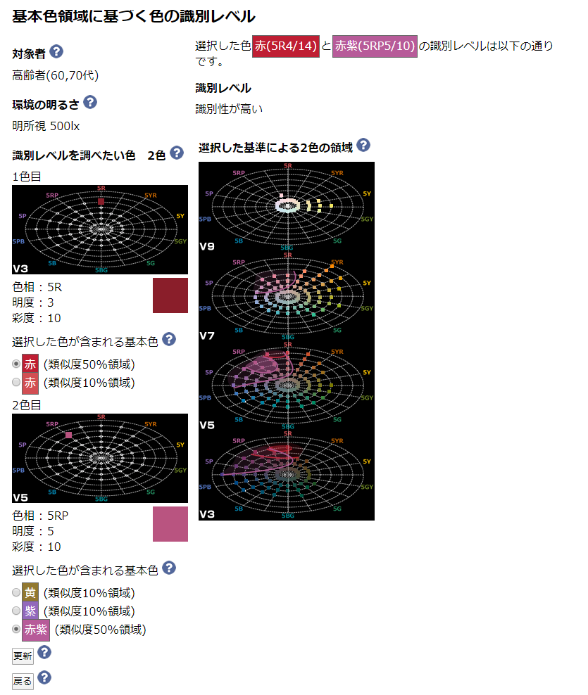 ここで示される数値は全て JISS0033:2006「JIS S 0033:2006 高齢者・障害者配慮設計指針―視覚表示物―年齢を考慮した基本色領域に基づく色の組合せ方法」及び,ISO 24505-1:2025 「人間工学 — アクセシブルデザイン 第1部:視覚障害のない若齢者及び高齢者のための色の組合せ」,ISO 24505-2:2025 「人間工学 —アクセシブルデザイン -第 2 部:色弱及びロービジョンのための色の組合せ」に基づいています。このデータベースに登録されているデータはこのJIS及びISOを作成時に実験により取得されたものです。